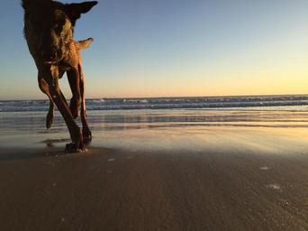 Keywords: beach sand dog sky water coast seascape horizon coastline