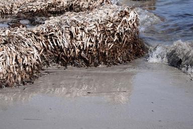 Keywords: beach sand sea seaweed mirroring water