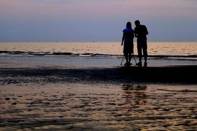 Keywords: beach sand sea water wave holiday sunset still nature landscape rest reflections evening abendstimmung dusk romantic atmospheric pair human people personal coast leisure back light silhouette mirroring scene north sea norderney