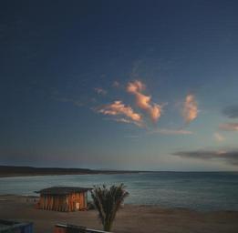 Keywords: beach sand shore ocean sea sunset dusk sky clouds hut trees nature landscape