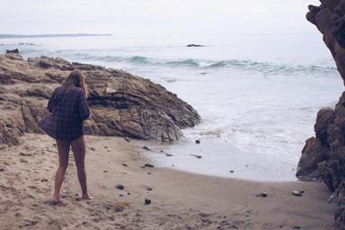 Keywords: beach sand water waves shore young girl people plaid shirt legs
