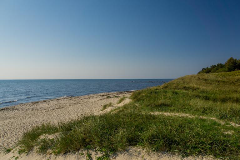 Keywords: beach sea dune coast blue green hill partly cloudy summer holiday rest background baltic sea bornholm
