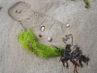 Keywords: beach seaweed still life footprint mussels sand summer trace bank
