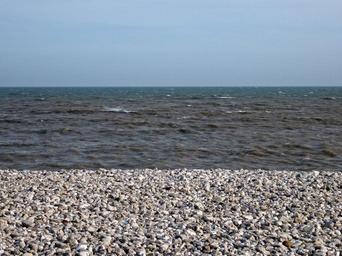 Keywords: beach shore pebbles three layers tricolour tricolor strata blue coast ocean sea coastline horizon sky textures water