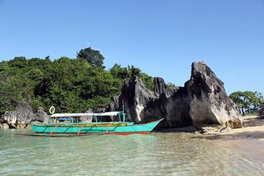 Keywords: beach summer place rock stone stone formation water breeze white sand sand mountain green mountain small waves clouds nature sky boat