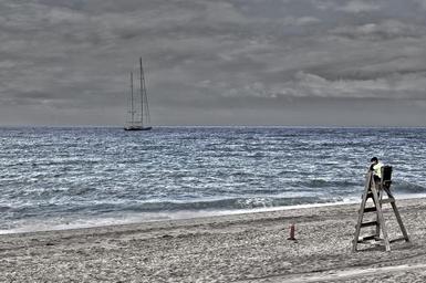 Keywords: beach watchman life guard guard booth sea sand boat soledad horizon marbella