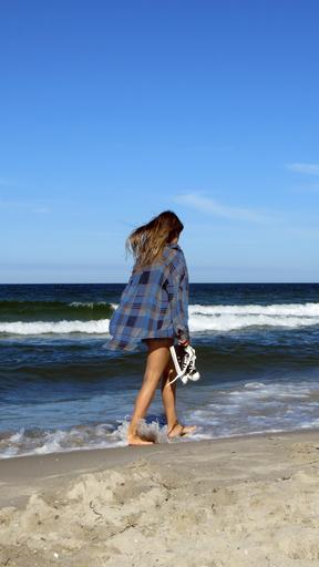 Keywords: beach woman walk go for a walk hiking sand bank landscape water sea