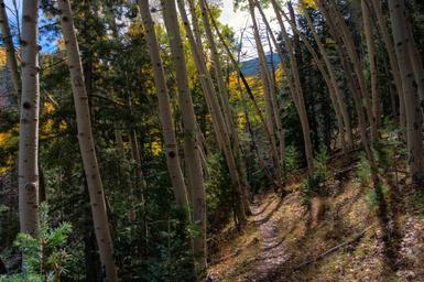 | Keywords: abineau-bear jaw loop abineaubearjawloop arizona bear jaw trail bearjawtrail bear jaw trail #26 bearjawtrail26 bear jaw trail no. 26 bearjawtrailno26 coconino national forest coconinonationalforest flagstaff ranger district flagstaffrangerdistrict forest service forestservice hdr kachina peaks wilderness kachinapeakswilderness san francisco mountain sanfranciscomountain san francisco peaks sanfranciscopeaks usfs aebhdr aspen aspens fall color fallcolor fall colors fallcolors fall foliage fallfoliage flagstaff forest hiking mountain outdoors peaks trail wilderness outdoor landscape tree plant Abineau Trail is a steep 1,800 foot climb over two miles up the slopes of the San Francisco Peaks through Abineau Canyon. The trail meets the Waterline Trail at the top, which can be followed down to Bear Jaw Trail to return to the trailhead. Each leg of the loop is around two miles long, plus a 0.4 mile connector trail from the trailhead to the loop, making a total loop hike of seven miles. The loop is one of the quintessential autumn hikes in the San Francisco Peaks. Aspens along all three legs of the loop turn gold, and falling leaves carpet the forest floor and decorate the conifers. A storm system passed through the area October 4-7, 2015, raining at lower elevations and snowing on the upper reaches of the San Francisco Peaks. The snow-capped Peaks were a wonderful treat after the few days grey, cloudy, wet weather that had put a damper on outdoor activity. Photo by Deborah Lee Soltesz, October 8, 2015. Credit: U.S. Forest Service, Coconino National Forest. For more information about this trail, see the Abineau-Bear Jaw Loop trail description on the Coconino National Forest website. Abineau Trail is a steep 1,800 foot climb over two miles up the slopes of the San Francisco Peaks through Abineau Canyon. The trail meets the Waterline Trail at the top, which can be followed down to Bear Jaw Trail to return to the trailhead. Each leg of the loop is around two miles long, plus a 0.4 mile connector trail from the trailhead to the loop, making a total loop hike of seven miles. The loop is one of the quintessential autumn hikes in the San Francisco Peaks. Aspens along all three legs of the loop turn gold, and falling leaves carpet the forest floor and decorate the conifers. A storm system passed through the area October 4-7, 2015, raining at lower elevations and snowing on the upper reaches of the San Francisco Peaks. The snow-capped Peaks were a wonderful treat after the few days grey, cloudy, wet weather that had put a damper on outdoor activity. Photo by Deborah Lee Soltesz, October 8, 2015. Credit: U.S. Forest Service, Coconino National Forest. For more information about this trail, see the Abineau-Bear Jaw Loop trail description on the Coconino National Forest website. |