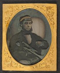 | Keywords: people ancient round photo border circle Ninth plate ambrotype in a half case. The plate is unbacked and it relies on a piece of black paper glued inside the case, so here it is removed from the preserver and placed directly on some black card. Sadly a lot of degradation. Ninth plate ambrotype in a half case. The plate is unbacked and it relies on a piece of black paper glued inside the case, so here it is removed from the preserver and placed directly on some black card. Sadly a lot of degradation. |