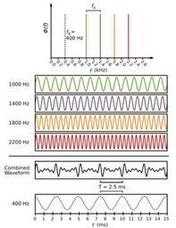 | Keywords: Beat frequency (1000, 1400, 1800, 2200).svg en A diagram showing four sinusoids of frequencies 1200 1400 1600 and 1800 hertz green purple orange and red Also shown is the summed signal black and the sinusoid with the same period as the beat frequency f<sub>0</sub> 200 Hz Above is the spectrum of the signals own Inductiveload 2009-02-15 Beat frequency 1000 1400 1800 2200 zh svg Beat frequencies Audiology Sensory Neuroscience Hearing and speech | ||||