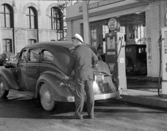 | Keywords: blackandwhite monochrome black and white Attendant filling gas tank of a 1937 DeSoto Touring sedan with British-American (B-A) Premium Peerless Ethyl gasoline at Harry Howe's Union Oil service station on Beatty Street (just north of Georgia Street and the west end of the old Georgia Viaduct) in Vancouver, BC. The Beatty Street Drill Hall can be seen in the background. 1945 photograph. [City of Vancouver Archives; Jack Lindsay, photographer] Attendant filling gas tank of a 1937 DeSoto Touring sedan with British-American (B-A) Premium Peerless Ethyl gasoline at Harry Howe's Union Oil service station on Beatty Street (just north of Georgia Street and the west end of the old Georgia Viaduct) in Vancouver, BC. The Beatty Street Drill Hall can be seen in the background. 1945 photograph. [City of Vancouver Archives; Jack Lindsay, photographer] |