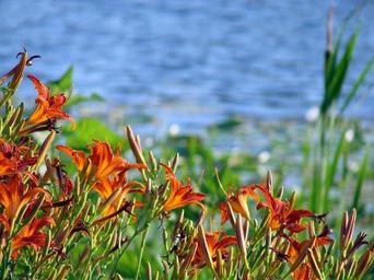 Keywords: beautiful nature blue lake orange lily colors contrast