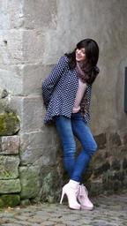 Keywords: beautiful pose nature model young women joy of life brunette makeup lips light healthy human high heels ankle boots pink jeans