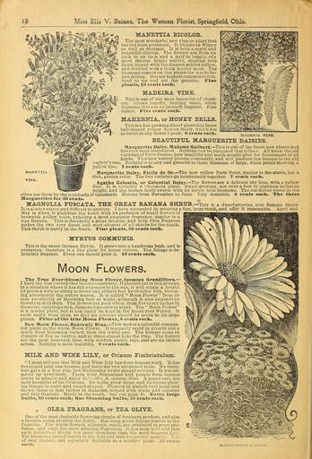 | Keywords: Beautify your homes (15727472334).jpg 18 <br> Miss Elia V Baines The Woman Florist Springfield Ohio <br> MANETTIA <br> MANETTIA BICOLOR <br> The most wonderful new vine or plant that <br> has yet been produced It blooms in Winter <br> as well as Summer It is both a rapid and <br> beautiful climber The flowers are from an <br> inch to an inch and a half in length of a <br> most intense bright scarlet shading into <br> flame tipped with the deepest golden yellow <br> and covered with a thick scarlet moss The <br> blossoms remain on the plants for weeks be- <br> fore falling Has my highest commendation <br> Send to me and get the genuine Fine <br> plants 10 cents each <br> MADEIRA VINE <br> This is one of the most beautiful of climb- <br> ers Grows rapidly bearing small white <br> blossoms that are exquisitely fragrant Fine <br> tubers Five cents each <br> MAHERNIA or HONEY BELLS <br> This is a fast-growing dwarf plant that bears <br> bell-shaped yellow flowers freely which are <br> as sweet as any flower I grow 6 cents each maderia vine <br> BEAUTIFUL MARGUERITE DAISIES <br> Marguerite Daisy Madame Gailbert This is one of the finest new plants that <br> f has ever been introduced Nothing can be imagined that is finer All know theold <br> varieties of Paris Daisies how beautiful and much sought after for decorations of all <br> kinds This new variety blooms constantly and will produce ten blooms to the old <br> variety's one Nothing is so airy and graceful as these blossoms of large white petals showing a <br> yellow disc 7 cents each <br> Marguerite Daisy Etoile de Or The new yellow Paris Daisy similar to the above but a <br> rich golden color The two varieties go handsomely together 7 cents each <br> Agatha Celestis or Celestial Daisy The flowers are a delicate sky blue with a yellow <br> disc It is certainly a charming plant Dwarf-growing not over a foot to eighteen inches in <br> height and the bushes fairly swarm with its lovely blue blossoms The cut-flower stores in the <br> cities use them by the hundreds of thousands Blooms from November to June Very desirable 8 cents each The three <br> Marguerites for 20 cents <br> MAGNOLIA FUSCATA THE GREAT BANANA SHRUB This is a dwarf-growing true Banana Shrub <br> It is always scarce and difficult to procure I have succeeded in securing a fine large stock and offer it reasonable April and <br> May is when it gladdens the heart with its profusion of small flowers of <br> brownish yellow color exhaling a most exquisite fragrance similar to a <br> ripe Banana This is decidedly a great favorite and with Olea Fragrans <br> makes the two very finest and most elegant of all shrubs for the South <br> This Shrub is hardy in the South Fine plants 50 cents each <br> MYRTUS COMMUNIS <br> This is the sweet German Myrtle It grows into a handsome bush and is <br> evergreen therefore is a fine plant for house culture The foliage is de- <br> liciously fragrant Every one should grow it 10 cents each <br> Moon Flowers <br> The True Ever-blooming Moon Flower Ipomoea GraMdiflora <br> I have the true variety that blooms constantly If planted out in rich ground <br> in a situation where it has full exposure to the sun it will attain a height <br> if given a wire or string to twine on of forty feet by October 15th bloom- <br> ing abundantly the entire season It is called Moon flower from its <br> rare peculiarity of blooming best at night although it also expands its <br> flowers in dull days The flowers are pure white from five to six inches in <br> diameter emitting a rich Jasmine-like odor at night The Moon Flower <br> is a tender plant but it can easily be kept in the house over Winter It <br> roots easily from slips so that no attempt should be made to lift large <br> plants Price of the true Moon Flower 8 cents each <br> New Moon Flower Heavenly Blue This makes a splendid compan- <br> ion plant to the white Moon Flower It is equally rapid in growth and a <br> much freer blooming variety than the white one The blooms come in <br> clusters of five to twelve and at times almost hide the vine The flowers <br> are the most heavenly blue with reddish purple rays and are six inches <br> across Nothing is more beautiful 8 cents each <br> MILK AND WINE LILY or Crinum Fimbriatulura <br> I must tell you that Milk and Wine Lily has done famous work It has <br> developed nine fine blooms and there are two unopened buds We there- <br> fore gave it a free ride last Wednesday to Our chapel services It was ad- <br> mired by everybody There were Bostonians and people from various <br> towns to admire and enjoy it Vrs E Adams Mass A grand sort the <br> most beautiful of the Crinums Its bulbs grow large and its strong-grow- <br> ing foliage is erect and sword-shaped Flowers in umbels very large and <br> showy three to four inches in diameter striped with white arid carmine <br> and very fragrant Hardy in the South See cut page 19 Extra large <br> bulbs 60 cents each; fine blooming bulbs 35 cents each <br> OLEA FRAGRANS or TEA OLIVE <br> One of the most desirable flowering shrubs of Southern gardens and also <br> a favorite house plant in the North Has deep green foliage similar to the <br> Camellia The white flowers although small are produced in great pro- <br> fusion and emit the most pleasing fragrance It has been well said that <br> each individual bloom has more sweetness than the most fragrant Lilv <br> The blooming period begins in the Fall and lasts for several mon ' is <br> of easy cuiture and especially desirable as a window plant 35 cents <br> each WAKGUBR1T 41878689 131125 64689 Page 18 Text http //www biodiversitylibrary org/page/41878689 1918 10 1080/00222939708680643 Ella V Baines Firm ; Henry G Gilbert Nursery and Seed Trade Catalog Collection NameFound CRINUM NameConfirmed Crinum EOLID 1087170 NameBankID 2663700 NameFound Ipomoea NameConfirmed Ipomoea sp cdK153 EOLID 23770052 NameFound Magnolia fuscata NameConfirmed Magnolia fuscata Andrews EOLID 125167