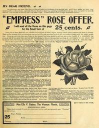Keywords: Beautify your homes (15729969933).jpg MY DEAR FRIEND a <br> On referring to my books I find that you did not make any purchases of me the past year and I have gotten up some very- <br> tempting offers on this circular especially for your benefit If there was anything unsatisfactory with any order you have ever received <br> from me write and tell me about it and 1 will make it right I cannot afford to have a single dissatisfied customer <br> EMPRESS ROSE OFFER <br> I will send all the Roses on this page <br> for the Small Sum of <br> 25 cents <br> Every one of these Roses are new varieties and everyone of them is a gem nothing of their colors compare with them for beauty <br> They are the hardiest of the everblooming roses and will live out anywhere even in the very coldest climates with but slight protec- <br> tion I have grown these choice new Roses by the thousand and have decided to give my patrons the benefit of a remarkable low <br> price so that all may plant them and see their exceeding great beauty; because they are cheap do not imagine for one minute that <br> the plants will not be strong and well grown I guarantee the safe arrival of all my plants anywhere in the U S Give me a trial <br> Fill out the coupon below and enclose with it 25 cents and secure the Empress Collection of magnificent Roses <br> New Hardy Ever-blooming Rose ALICE ADDRIOH ” The most richly <br> and sweetly scented Hardy Rose A perpetual-blooming Hardy Rose The hardiest <br> of Hardy Koses The most double and beautiful of Perpetual Roses The most <br> unique of all Roses This new and distinct Rose is truly wonderful It is a pioneer <br> of a new and most valuable race namely absolutely hardy perpetual blooming and <br> sweetly scented Roses The Alice Aldrich is a hybrid between Rosa Rugosa and that <br> splendid old variety of the hybrid perpetual or remontant class Caroline de Sansal <br> In habit of growth and foliage it strongly resembles the rugosa species possessing the <br> same abundant rich dark green clean and healthy foliage and Moss Rose-like buds <br> In like manner it inherits the property of this species of blooming with <br> great profusion in June and continuing to flower throughout the summer and autumn <br> It also possesses all the ruggedness and iron-clad hardiness of its Japanese parent <br> On the other hand the flower in make-up finish color and fragrance of its flowers <br> resembles to a greater degree the Caroline de Sansal The Roses are medium to <br> large in size densely double beautiful in bud and of pure bright peach-blow pink <br> throughout There is no other rose we have ever grown that is so rich in delicious <br> damask perfume Unlike almost all other Roses its foliage is exempt from mildew <br> and the attacks of insects or slugs remaining healthy clean and bright deep green <br> until turned to a crimson color by frost In this Rose are united iron-clad hardiness <br> and perpetual bloom that is richly and sweetly scented ” not to mention the beauty of <br> form color and make-up and doubleness of Alice Aldrich <br> MEDIA ” New Golden- Yellow Tea Rose ” This is the grandest of all yel- <br> low Roses and should be planted by everybody Its flowers are of the largest size <br> perfectly double to the center and of the most perfect shape both in bud and blossom <br> while its color is a degree of loveliness unapproached by any other Rose beiag a rich <br> deep golden-yellow with decided sulphur tints The brightness and richness of this <br> Rose is the admiration of all beholders We have grown in our establishment some <br> fifty varieties of yellow Roses and think Media the best <br> The Gold Medal Rose JUBILEE ” Its wealth of color ” A pure red in its <br> deepest tone shading to deep crimson-red and velvety maroon-red in the depths of <br> the petals The coloring is alive as one expressed it It fairly glows in its rich <br> warmth of coloring another said It is admirable unique and as Mr Schnyler <br> Matthews the celebrated artist said This Rose contains the darkest eclor combined <br> with pure color of which nature is capable It will require centuries to produce <br> its equal ” if it ever is produced ” for nature i3 not prolific in repititions <br> PRISOILLiA ” The Charming New White Tea Rose ” Another <br> new American Rose but as widely different from all other white Roses as one <br> can well imagine It belongs to the Tea class Hardy here in Northern Ohio <br> with slight protection in Winter Its habit is exceedingly strong and upright <br> and it possesses large beautiful foliage and is a most profuse and constant <br> bloomer The flowers are of enormous size remarkably round and full pure <br> clear snowy-white throughout and are delightfully Tea-scented It is by far <br> the finest and most reliable white bedding Rose yet produced Without ques- <br> tion the largest white Rose both in bud and flower No other Rose of its color <br> approaches it in size <br> SOUV DE PRESIDENT OARNOT ” This new Rose is away above <br> the average in many good qualities It is a Rose of the largest size beautiful <br> both in bud and open flower The buds come on long stiff stems in clusters <br> of from six to twelve Each individual flower stands out distinct on its stem <br> No crowding as in the case of so many Roses that bloom in clusters The <br> color is distinct and novel a lovely fawn shading to pearl It often measures <br> five to six inches in diameter Delightfully fragrant We know of no finer <br> Rose than President Carnot Try it It will be sure to please you <br> coupon Miss Ella V Baines The Woman Florist coupon <br> SPRINGFIE LD OHIO <br> Please find enclosed 25 cents for which send me by mail postage paid your Empress' <br> set of five Moses <br> 25 <br> County <br> Your Name <br> PZO <br> State <br> DON'T WRITE IN THIS SPACE 41878669 131125 64689 Text http //www biodiversitylibrary org/page/41878669 1918 10 1080/00222939708680643 Ella