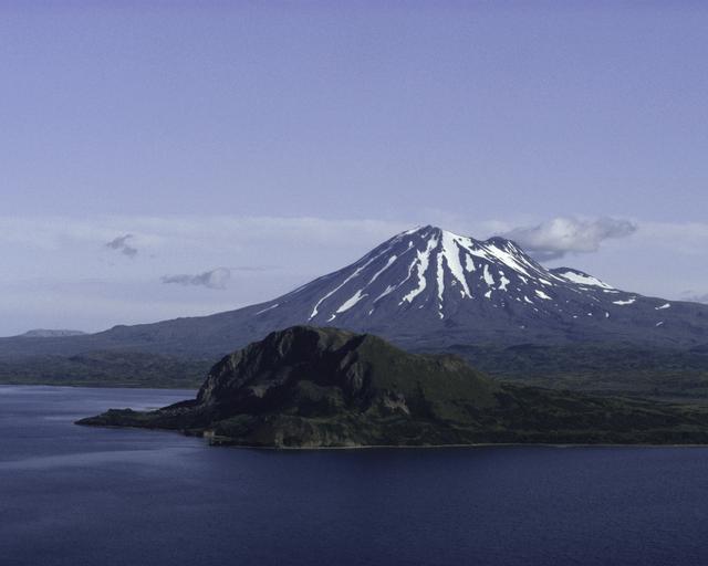 MAKE A MEME View Large Image Becharof National Wildlife Refuge,Alaska.jpg en The Peulik volcano background and Becharof Lake foreground in the Becharof National Wildlife Refuge what lays in Alaska 1956 R J Wilk U S Fish and Wildlife Service US-FWS from US-FWS Becharof ...