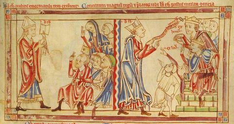 | Keywords: Becket excommunicates the guilty, and meets the kings - Becket Leaves (c.1220-1240), f. 2r - BL Loan MS 88.jpg author ; possibly Thomas Becket excommunicates all his enemies in 1166 <br />Right Becket pleads his case before Henry II of England Henry II above and Louis VII of France Louis VII below ~ 1220 1240 John Paul Getty Jr Sir Paul Getty collection Wormsley Park ; on long-term loan to the institution British Library object history credit line inscription S Th auditis enormitatibus reos excommunicat Concilium magnum regum et prelatorum ubi beatus Thomas passus multa convicia St Thomas having heard the transgressions excommunicates the defendants The great meeting of kings and prelates where blessed Thomas suffered many reproofs top la inscription Prelatis adquiesco salve honore Dei I acquiesce to the prelates save for the honour of God On scroll in Becket's hand la inscription rex henr King Henry by King Henry la inscription rex lod King Louis by King Louis la See Angelfire website for http //www angelfire com/pa4/becketleaves/becketleavesorig3 html accompanying verses and an http //www angelfire com/pa4/becketleaves/becketleaveseng3 html English translation accession number Loan MS 88 f 2r The Becket Leaves La vie de Seint Thomas de Cantorbéry a French-verse history of the life of Thomas Becket with large illuminations <br /> This file from C J Birkett's http //www angelfire com/pa4/becketleaves/ Becket Leaves website on Angelfire http //www angelfire com/pa4/becketleaves/becketleavesorig3 html webpage http //www angelfire com/pa4/becketleaves/tb3 jpg file PD-old-100 <gallery> File The Becket Leaves jpg File The Becket Leaves jpg </gallery> Uploaded with UploadWizard The Becket Leaves c 1220-1240 - BL Loan MS 88 02r Henry II of England Louis VII of France |