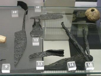 | Keywords: BedfordMuseumSmallIronTools.JPG en Six small iron tools on display at Bedford Museum No 10 - C3 AD part of Romano British shears; No 11 - C7 AD Saxon knife found in Harold; No 12 - C3 AD Romano British short bladed tool; No 13 - C2/C3 AD Romano British socketed blade; No 14 - C1 AD Romano British mortising chisel; No 15 - C4 AD Romano British tanged punch own Simon Speed 2010-09-14 Photos by Simon Speed Bedford Museum Bedford | ||||