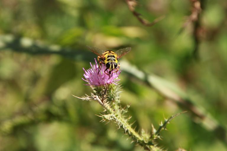 Keywords: bee black flowers striped thistle wasps yellow insects nature