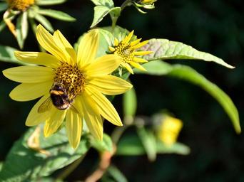 Keywords: bee blossom bloom close nature flower insect yellow sprinkle hard working insect bloom