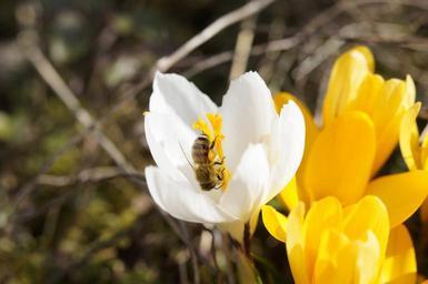 Keywords: bee collect pollen close pollen blossom bloom foraging food intake panties sprinkle pollination insect crocus