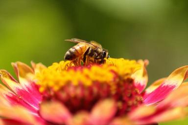 Keywords: bee flower zinnia nature yellow pollen insect bug