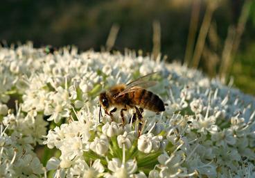 Keywords: bee honey bee insect nectar pollinate feeding flower bee on flower hogweed summer bright sunshine macro