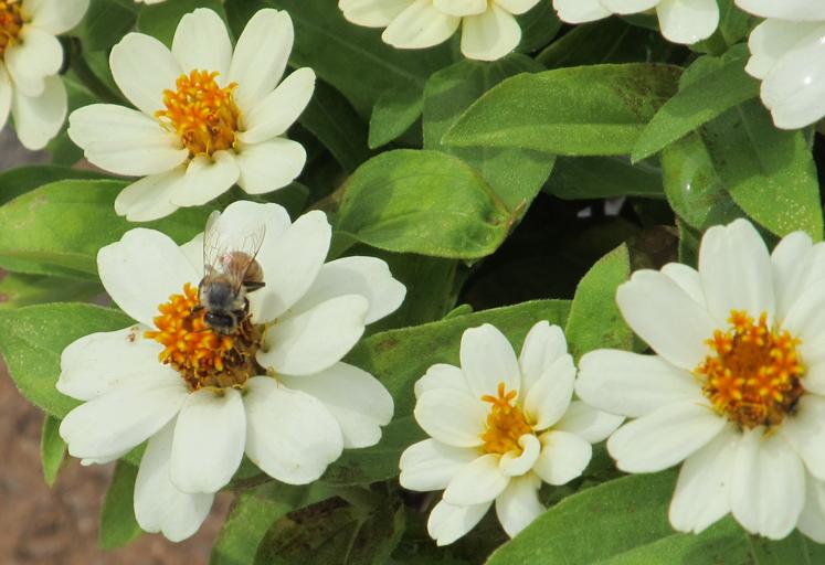Keywords: bee white flower petals pollen white flower nature insect garden pretty pollinating nectar honey hive bumble bee color plant green planting daisy