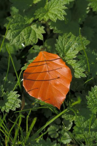Keywords: beech leaf fall color brown withered fallen autumn leaves grass still life nature shadow stinging nettles beech fagus sylvatica fagus red book