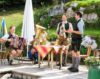 Keywords: beer garden music bavaria tradition instrument beer chapel drink music band celebrate leather pants musician costume germany accordion trombone trumpet human