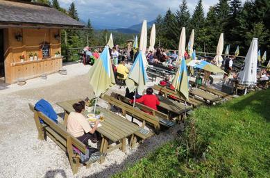 Keywords: beer garden music bavaria tradition beer drink celebrate leather pants germany human mountains view mountain hut rest enjoy mood parasol sunshine holiday