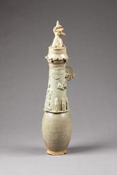 | Keywords: Begravningsurna drejad i Kina under Södra Song dynastin (1127-1279) - Hallwylska museet - 96156.tif LSH artwork sv URNA Begravningsurna med lock behållare för ris Gravfynd Qingbai-yao Nedre delen har en långsträckt oval form medan övre delen är konisk med dekor av pålagda figurer Locket är koniskt med en knopp i form av en fågel Mellersta delen har 8 stående figurer gudar Ovanför detsamma sitter Buddha vänd framåt; upptill på vardera sidan en fågel; baktill en ödleliknande drake och solskivan som vilar på moln bildar ett öra Figurer och ornament är pressade i formar Glasyr på utsidan ljust gröngrå samt finsprucken Godset är blekt brunrött Invändigt märken efter drejning Förekom vanligen i par Enligt Bukowskis katalog funnen i Korea <br/>Köpt hos Bukowskis 1919 Pris 1 710 Kr<br/>Funerary Jar Southern-Song 12-13th century Qingbai-ware According to the Hallwyl Collection catalogue the urn was found in Korea <br/>It was a practice in Song China particularly in the south to leave offerings of rice in the tombs of the wealthy The grain was contained in pairs of jars that were buried with the dead This tall burial jar is one of a still-surviving pair both of which are in the Museum's collection It bears the Vermilion Bird of the South on its lid and the Green Dragon of the East on its neck together with figures of the sun god and star gods V A original caption Begravningsurna drejad i Kina under Södra Song dynastin 1127-1279 <br/> Nyckelord Död Begravning Lergods - 1127 1279 size cm 9 7 mynningskant size cm 10 lock size cm 12 fotkant size cm 16 lock size cm 17 2 size cm 75 HWY place of origin CN original filename hm_dig12698 14688 inventory number HWY XLVIII IV B a d 02 96156 CC-BY-SA Jens Mohr <gallery caption Different images of same object > File Begravningsurna - Hallwylska museet - 96182 tif </gallery> Death Earthenware Chinese ceramics in the Hallwyl Museum Sweden Urns Jens Mohr Media contributed by LSH dim-with multiple size templates Media contributed by LSH unmatched keyword Media contributed by LSH 2014-11 |