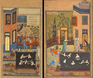 | Keywords: Behzad Vorbild und Nachahmung.jpg de Vorbild und Nachahmung Ein Szene aus Nezāmis Khamsa links von einem unbekannten Herater Maler um 1462 rechts von Behzād um 1495 Metropolitan Museum of Art 13 228 13 fol 47r und BL Or 6810 fol 190r Unbekannter Maler und Behzād um 1426 und um 1495 PD-old-100 Kamal-ud-din Bihzad |