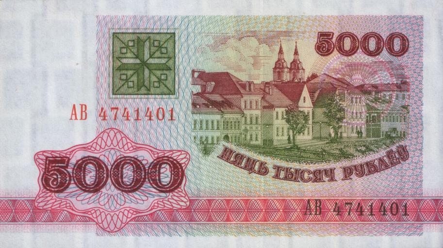 | Keywords: Belarus-1992-Bill-5000-Obverse.jpg be 5 000 ублёў 5000 roubles of Belarus 1992 es 5 000 rublos 5000 ублей Бело уссии 1992 own scan 1992 National Bank of Republic of Belarus ациональный банк Республики Бела усь ацыянальны Банк Рэспублiкi Бела усь PD-BY-exempt banknotes Banknotes of Belarus 1992 Banknotes with a face value of 5000 Traetskaye suburb Minsk Cities on banknotes | ||||