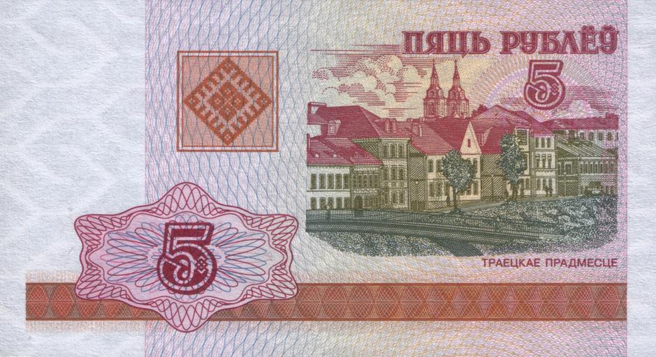 | Keywords: Belarus-2000-Bill-5-Obverse.jpg 5 ублей Бело уссии 2000 5 roubles of Belarus 2000 own scan 2000 National Bank of Republic of Belarus ациональный банк Республики Бела усь ацыянальны Банк Рэспублiкi Бела усь PD-BY-exempt banknotes Banknotes of Belarus 2000 Traetskaye suburb Minsk Banknotes with a face value of 5 Pink banknotes Cities on banknotes |