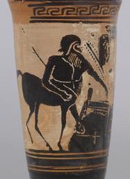 | Keywords: Beldam Painter - Herakles and Pholos - Walters 48229 - Left Detail.jpg The surface of this lekythos a vessel for holding liquids such as oil or perfume is covered with an assortment of lines and a meander pattern on red on the neck shoulder and base It likely depicts a scene from Herakles' life that was parallel to his main labors These side-adventures or parerga were entertaining and provocative narratives of interest to artists Here we see a draped male figure leaning against a rock who can be identified as Herakles by the quiver and the club above his head He looks to the left and as our eye moves around the side of the vase following his line of vision we encounter a centaur standing before a pithos and facing the hero This has been identified as the encounter of Herakles and Pholos a centaur who lived in the Peloponnese and dwelt in a cave on Mount Pholoe While Herakles was in search of the Erymanthian boar Pholos offered him hospitality Despite Pholos's warnings Herakles demanded wine When Pholos opened the wine container the other centaurs nearby became agitated and attacked causing Herakles to defend himself with his arrows In some versions of the story the wise centaur Cheiron was wounded in this incident whereas in other versions Herakles accidentally killed Pholos by dropping a poisoned arrow on his foot The scene depicted here shows the last moment of calm before the storm Pholos has his hand already above the pithos and is about to pour Herakles a drink ca 500 BC terracotta cm 24 7 6 accession number 48 229 36555 Joseph Brummer New York date and mode of acquisition unknown Henry Walters city Baltimore Walters Art Museum Henry Walters Acquired by Henry Walters 1924 Heroes Mortals and Myths in Ancient Greece The Walters Art Museum Baltimore; Frist Center for the Visual Arts Nashville; San Diego Museum Of Art San Diego; Alexander S Onassis Public Benefit Foundation USA New York 2009-2011 place of origin Attica Greece Walters Art Museum license Pholus in ancient Greek pottery Ancient Greek black-figure pottery in the Walters Art Museum Beldam Painter White-ground lekythoi Media contributed by the Walters Art Museum needs artist update |