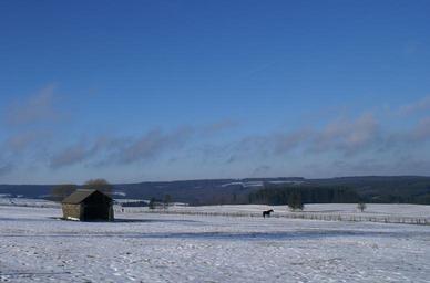 Keywords: belgium ardennes pasture snow winter blue sky barn
