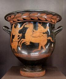 | Keywords: Bell-krater rider Louvre G493.jpg Young rider crowned by a winged Nike Victory Side A of an Apulian red-figure bell-krater Jeune cavalier couronné par Niké la Victoire Face A d'un cratère en cloche apulien à figures rouges Giovane cavaliere incoronato da Nike in volo Lato A di un cratere a campana apulo a figure rosse Un călăreț tânăr încoronat de către zeița Nike Victoria Fața A a unui crater apulian în formă de clopot cu figuri roșii ca 420 BC red-figure ceramic cm 34 6 34 9 35 5 Institution Louvre department object Greek Etruscan and Roman antiquities room ID 31 7833 object history Taranto in province Campania Italy Joseph-François Tochon d'Annecy credit line ProvenanceEvent purchase 1818 accession number G 493 own photo date 2006 Marie-Lan Nguyen artwork license PD-old-100 photo license other versions <gallery> Image Nike rider Louvre G493 jpg Detail </gallery> Riders in ancient Greek pottery Bell kraters Sisyphus Painter Greek antiquities in the Louvre - Room 44 Tochon Collection 420s BC pottery in France Paris Nike in ancient Greek pottery Horses in ancient Greek pottery |