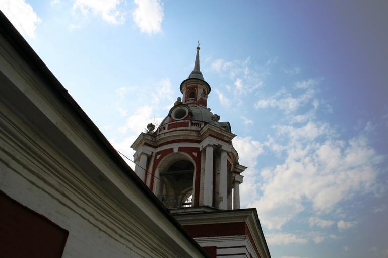 Keywords: bell tower pillars white deep red arch ornate sky clouds wall