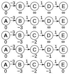 | Keywords: Bellman-Ford worst-case example.svg en A worst-case example graph for Bellman-Ford algorithm a simple path with 5 vertices Assuming that the source is A and the edges are processed from right to left it will take V - 1 or 4 iterations for the minimum distances labelled below each node to fully converge Conversely if the edges are processed from left to right it will converge in a single iteration and the diagram can be interpreted to mean how the estimates change after examining each edge own User Dcoetzee 2012-12-17 Shortest paths algorithms 5x5 arrays Linear graph 5 Directed graphs Graphs with 5 vertices Cc-zero |