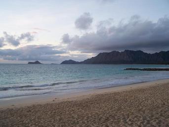 Keywords: bellows beach morning ocean coastline shore clouds sand hawaii oahu