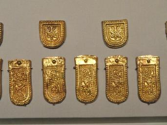 | Keywords: Belt buckle and lappet fittings, view 5, Iran, Sasanian period, 7th century AD, silver and gilt (buckle) and gold - Arthur M. Sackler Gallery - DSC05839.JPG en Exhibit in the Arthur M Sackler Gallery Washington DC USA This artwork is old enough so that it is in the public domain Photography was permitted in the museum without restriction 2013-02-12 16 43 04 own Daderot cc-zero Belt buckle and lappet fittings Sackler Gallery Uploaded with UploadWizard | ||||