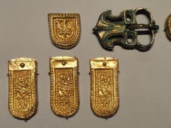 | Keywords: Belt buckle and lappet fittings, view 7, Iran, Sasanian period, 7th century AD, silver and gilt (buckle) and gold - Arthur M. Sackler Gallery - DSC05845.JPG en Exhibit in the Arthur M Sackler Gallery Washington DC USA This artwork is old enough so that it is in the public domain Photography was permitted in the museum without restriction 2013-02-12 16 43 04 own Daderot cc-zero Belt buckle and lappet fittings Sackler Gallery Uploaded with UploadWizard | ||||