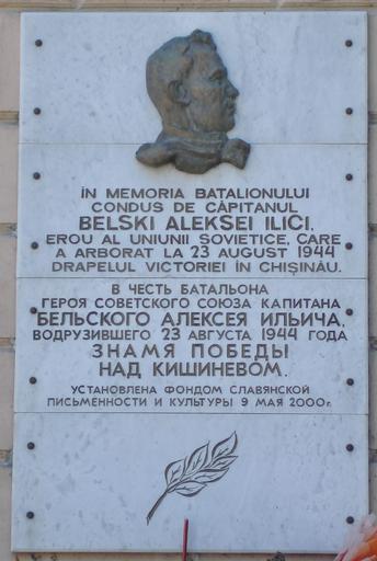 | Keywords: Beltskii memorial.jpg емо иальная доска в честь батальона ге оя Советского Союза капитана Бельского Алексея Ильича вод узившего 23 августа 1944 года знамя Победя над Кишинёвом Own 2006 User Zserghei FoP-Moldova Centru Monuments and memorials in Chișinău Multilingual plaques in Moldova Plaques in Chișinău |