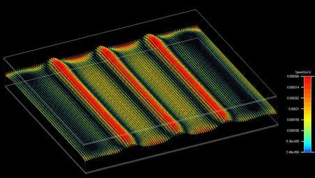 | Keywords: BenardConvection-2.png CFD software Flotherm The enclosure dimensions were set to 100 x 100 x 15 mm<sup>3</sup> the temperature difference between the upper and the lower plate was set to 1 °C The air speed distribution is shown at a cross-section in the middle between the upper and the lower enclosure walls The maximum speed is approximately 0 3 mm/s CFD Software Flotherm Abmessungen der Box betragen 100 x 100 x 15 mm<sup>3</sup> die Temperaturdifferenz zwischen der oberen und unteren Wand beträgt 1 °C In der Mitte zwischen der oberen und unteren Wand ist die errechnete Geschwindigkeitsverteilung dargestellt Die maximale Geschwindigkeit beträgt etwa 0 3 mm/s own Harke 02 05 2008 Flotherm Rayleigh “Bénard convection Flow visualization with computational fluid dynamics software |