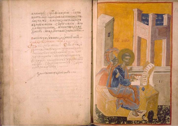 Keywords: Bence Bible Luke.jpg иниатю а на евангелиста Лука от Бенчевското четве оевангелие http //staroslovenski nubsk edu mk/bencevski-liturgiski-zbornik-16v html 16 C author PD-old The Four Gospels of Benče