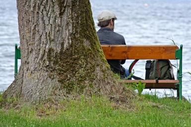 Keywords: bench bank person human sit seat nature out water lake tree alone individually