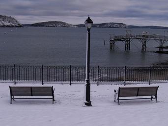Keywords: bench benches relax seats lamppost street lamp islands ocean bay harbor sea coast coastline new england maine winter wintertime snow snowy