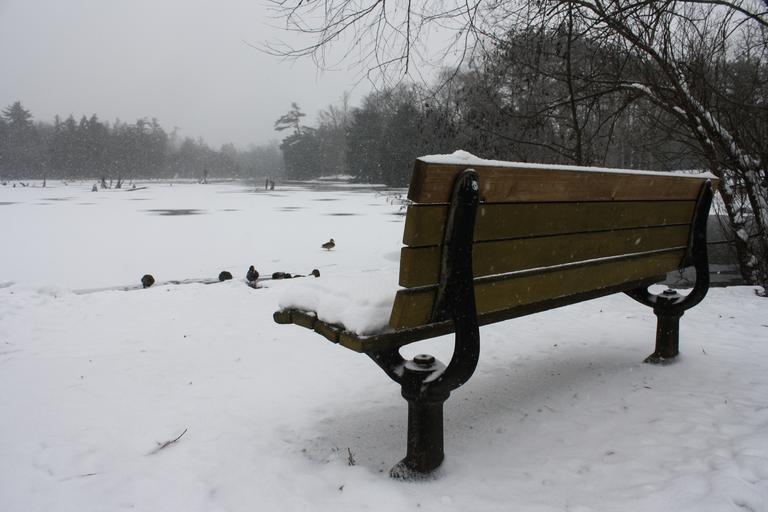 Keywords: bench lake landscape duck sitting nature winter snow cold lonely outdoor