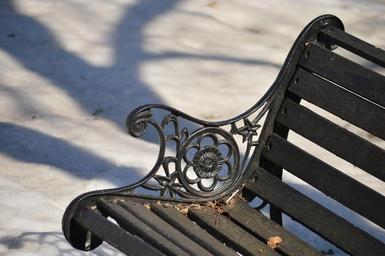 Keywords: bench sit metal wood park outdoor leisure lifestyle empty snow outside metal work armrest fancy